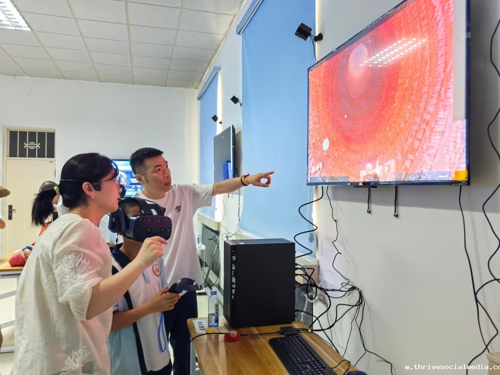在“消化漫游VR体验”系统前,学生们戴上VR头盔,化身为“食物小精灵”,在消化系统中自由穿梭。从口腔出发,经过咽、食管,再到胃、小肠和大肠,一路感受着消化系统的神奇运作。语音、文字和动画的巧妙配合,让学生们轻松掌握了消化系统的结构和消化过程中消化液的作用。完成这一精彩体验后,学生们纷纷来到工作人员处,自豪地领取了第一枚小印章。